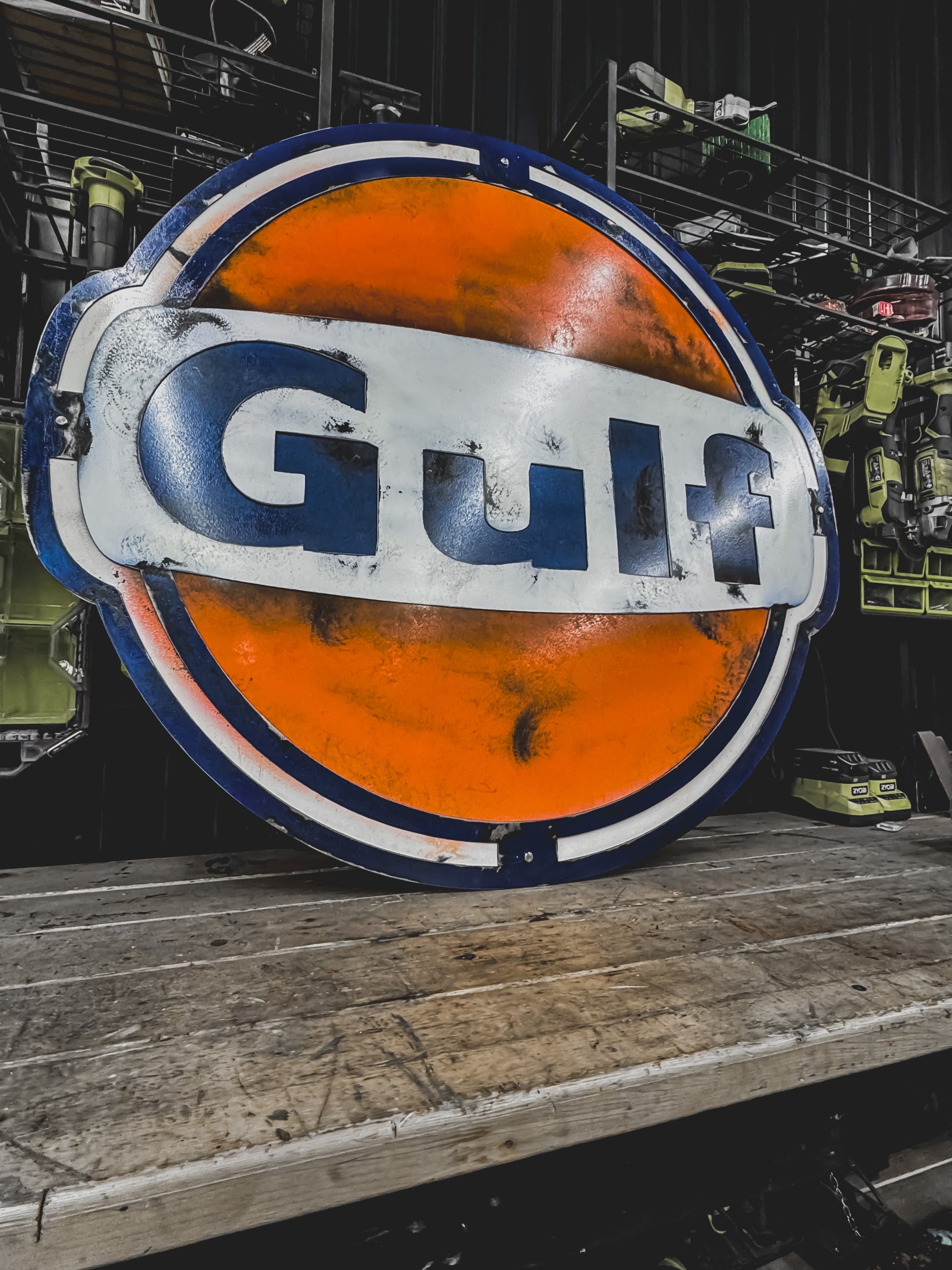 Paying tribute to the golden era of American service stations, the Rustic Vintage GULF Station sign is a bold statement piece straight out of a bygone highway era. Inspired by classic GULF gas station signage, this sign blends nostalgia with raw, industrial craftsmanship.